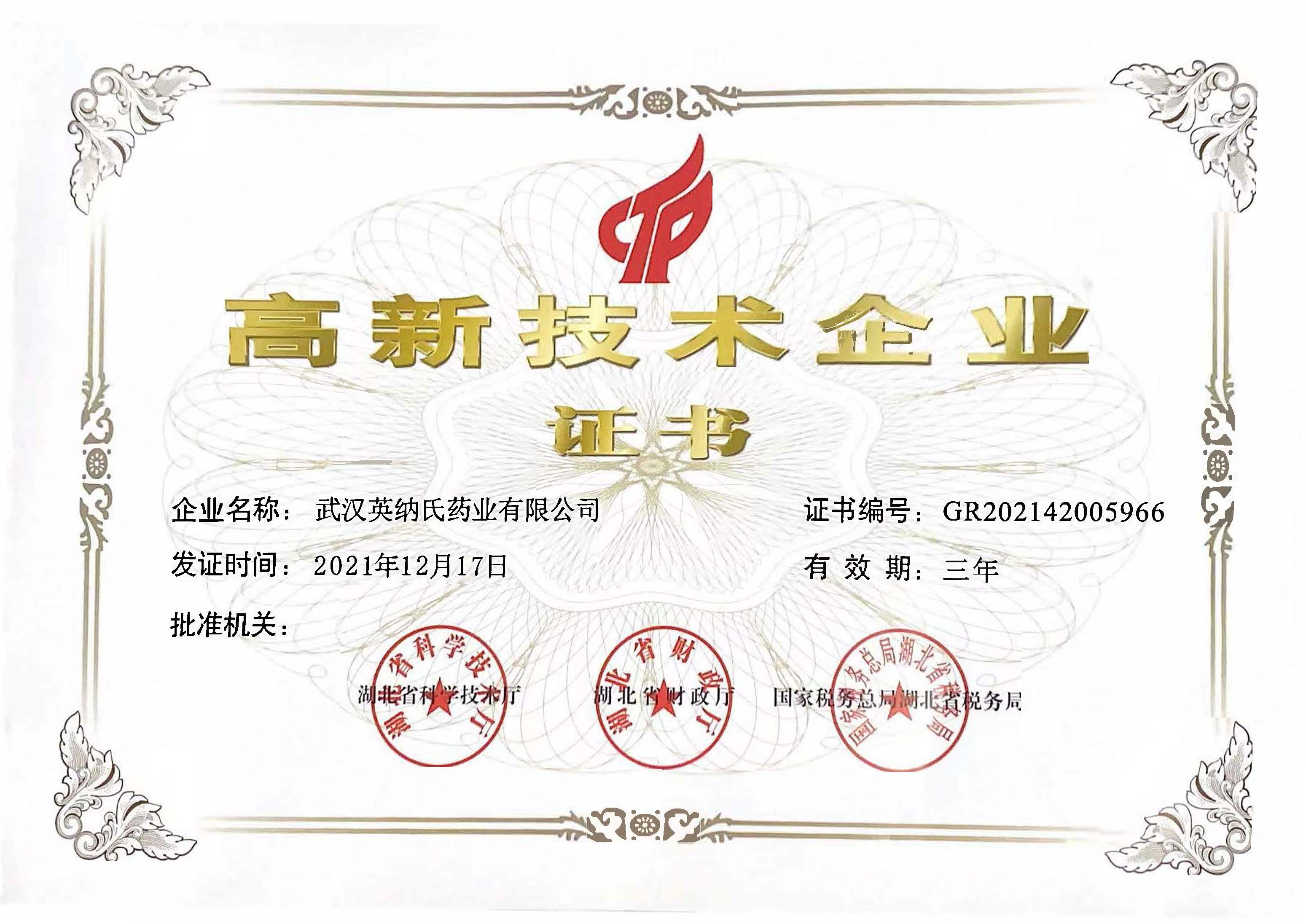 武(wu)漢英納氏(shi)-高新技術企業證(zheng)書